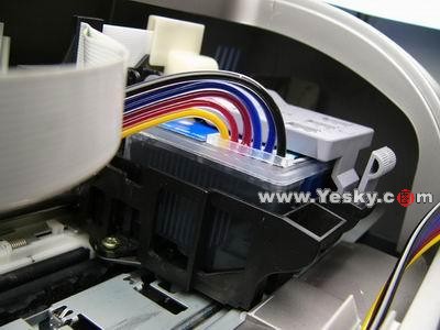 這是目前無海綿連續(xù)供墨系統(tǒng)最理想的走線方式,設(shè)計為一體,接頭在墨盒表面蓋子的下面,美觀大方
