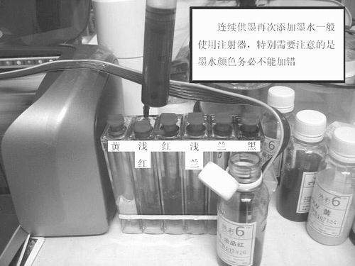 3.打印機(jī)使用連續(xù)供墨系統(tǒng)以后的日常保養(yǎng)工作不可忽視以下幾點:①打印機(jī)擺放位置不能被日光直接照射,同樣,外墨盒盡量不要長期被紫外線照射,以免外墨盒墨水保存時間縮短,如果受使用條件的限制,可以將外墨盒做遮光處理或者選用外墨盒有防紫外線盒子的連續(xù)供墨。②外墨盒上都有通氣孔,打印機(jī)的使用環(huán)境就需要注意防塵工作。③打印機(jī)不能長期不使用。噴頭在打印中是否有斷線,與氣候、環(huán)境、墨水質(zhì)量、自身狀況等都有關(guān)系,最好每半個月至少使用1次,氣候特別干燥的地區(qū)每周至少使用1次,如確實無打印任務(wù),可以打開打印機(jī)電源后,打印一張噴嘴檢查圖以便確定噴嘴狀況。④外墨盒再次添加墨水方法按照說明書操作即可,需要注意的是打印機(jī)外墨盒的墨水最好不要使用一點就馬上添加,墨水存放有一個保質(zhì)期,每色使用到一定極限再添加為好;添加墨水的時候也要注意不要加得過滿,更不能添加錯顏色(圖14)。⑤不同牌子的墨水不要混用,如果要換其他牌子墨水,應(yīng)將外墨盒中的墨水抽干后再更換,顏料墨水和染料墨水之間需要互換,應(yīng)當(dāng)先將整個連續(xù)供墨系統(tǒng)的墨水都抽干凈并進(jìn)行清洗。