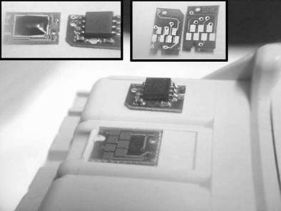 二是墨盒芯片對位不準(zhǔn)確沒有被打印機(jī)檢測到。目前國內(nèi)永久芯片沒有一個統(tǒng)一標(biāo)準(zhǔn),比如芯片的體積大小和厚薄,當(dāng)更換另一種芯片后,由于體積大小和厚薄的不一致,造成打印機(jī)無法檢測到芯片;還有一些內(nèi)墨盒上芯片放置位置做工上的精確度不高,這樣就或多或少影響到芯片在墨盒上的固定點的精確度;當(dāng)然墨盒標(biāo)準(zhǔn)尺寸不夠也會造成與打印機(jī)的彈簧接觸點對位不準(zhǔn),使打印機(jī)無法檢測到永久芯片(圖13)。